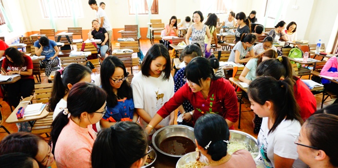仰光大学作为缅甸历史最为悠久、最为出名的大学,自然是培养了不少作为非凡的人才。如今我们有幸在这里学习,没有不努力的道理。现在已是三月底,同学们都在做好期末考的冲刺准备,早早起来晨读,晚上也看书到很晚才睡是很多同学的常态。学校给我们开设的课程除了缅甸语听、说、读、写,还有历史、地理、传统文化、文学等科目,仔细观察一下,可以发现每一位同学都取得了很大的进步。不止在学习上,在生活上也得到了很好的历练,如何将缅甸语运用到实际生活中,并在实际生活中提高缅甸语水平也成了我们的学习目标之一。所以,学校附近的菜市场、超市、服装店、杂货市场都成了我们练习口语、学习新词汇的好场所,时不时遇见几位同学边说边比划,突然又脑卡不知如何说歪着头思索的场面也十分有趣,每当这时,大家要么互相帮助,实在谁也不知道也会用尽力气让小贩明白我们所指,最终给我们正确的语言指导。