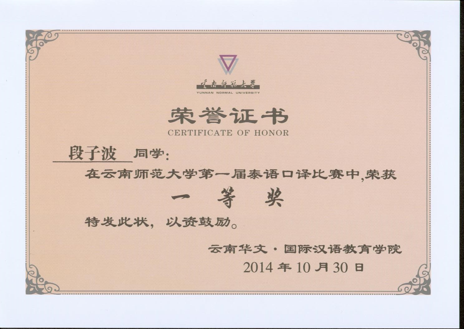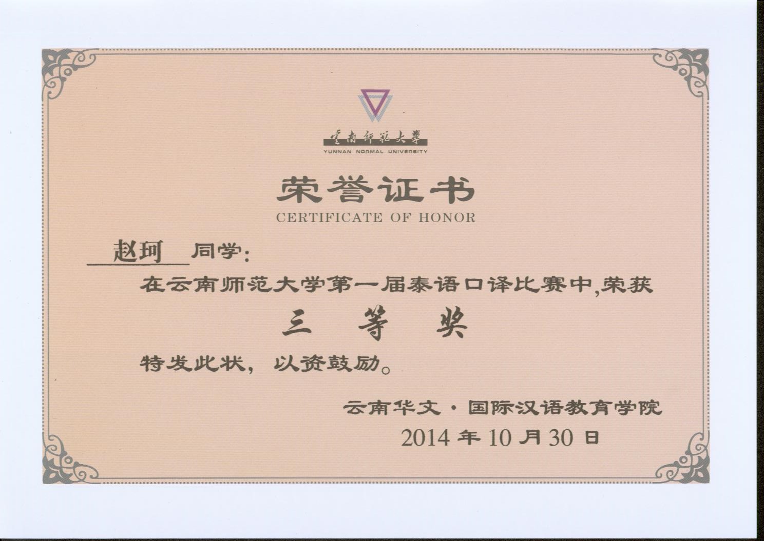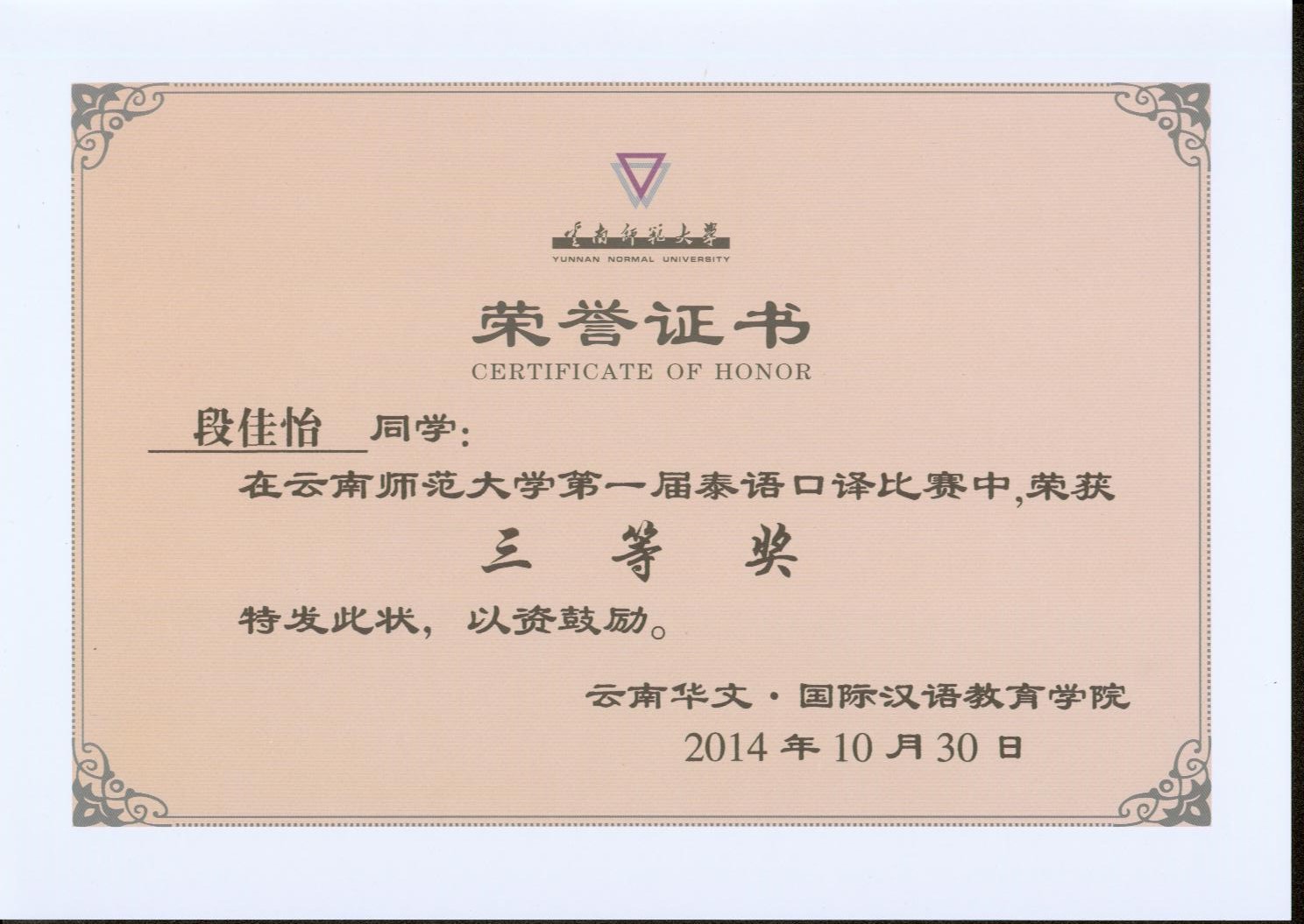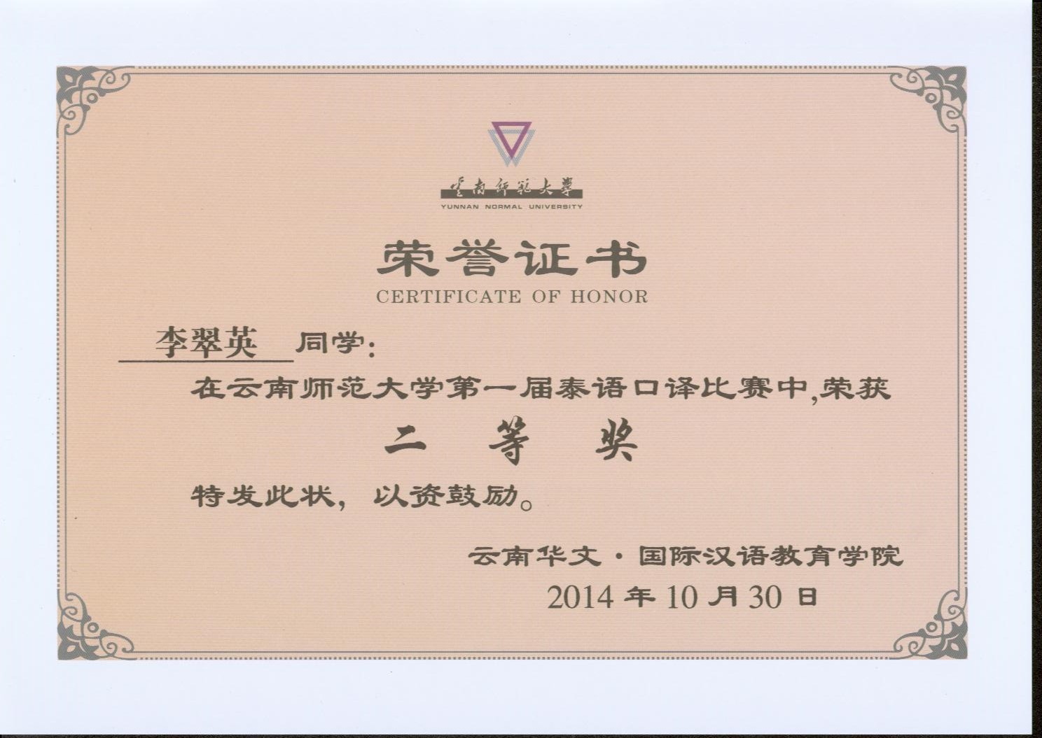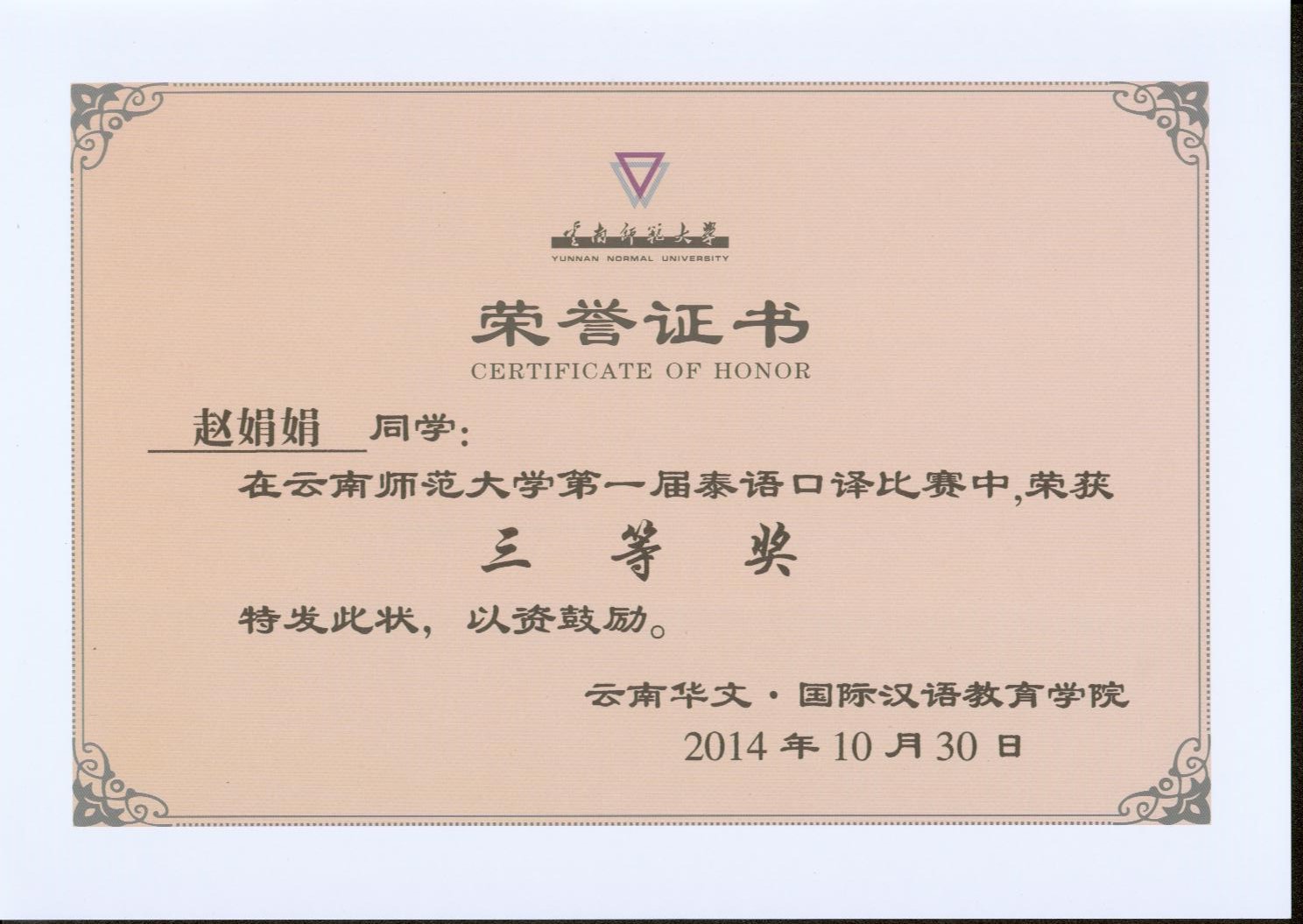2014.10云南师范大学泰语口译大赛荣誉证书