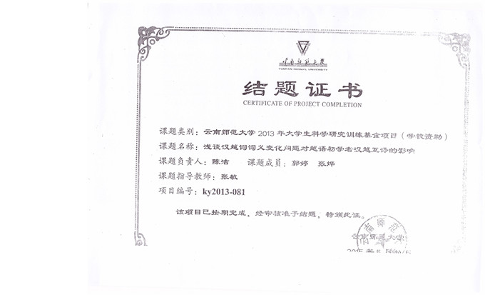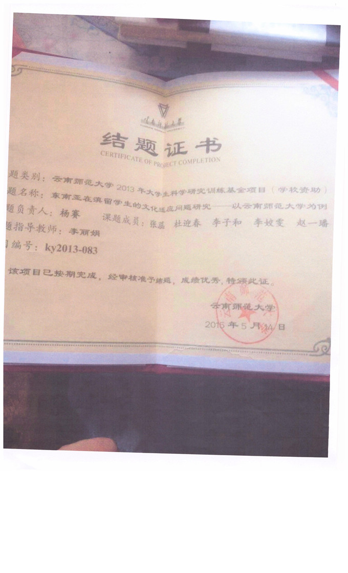 2015年6月,泰语专业段召阳老师指导的本科生毕业论文“中泰味觉词对比分析”(赵娟娟)被评为云南师范大学2015届本科毕