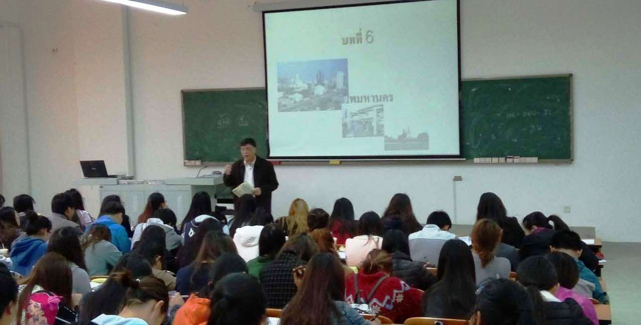 2016年3月6日—3月18日,广东外语外贸大学黄进炎教授和林秀梅教授应邀前来我院讲学,为我院12级泰语专业学生精心讲授了《泰国文学选读》、《泰语翻译理论与实践》两门课程,同时为全院师生开了《泰语口语与书面语比较》、《泰语教学中的泰语翻译》两个专题讲座,并与泰语专业师生开展了深入地交流互动。