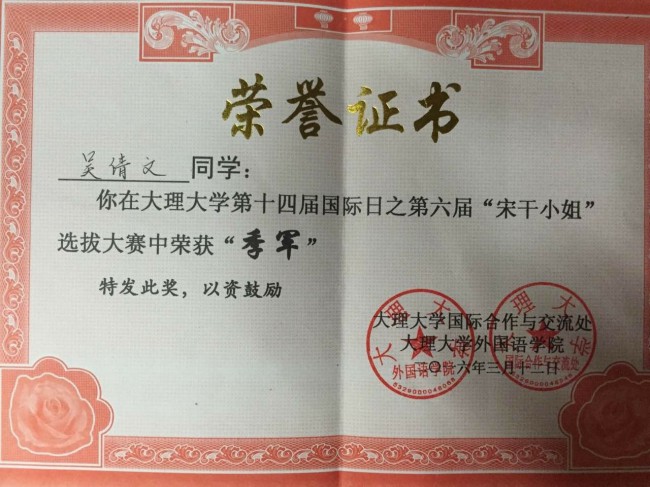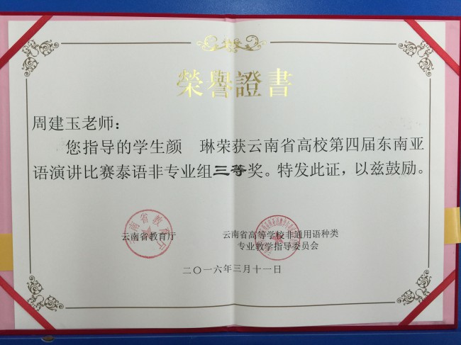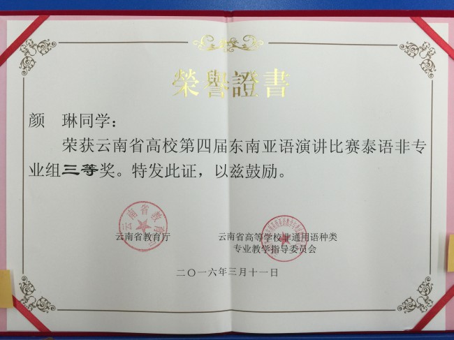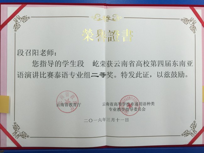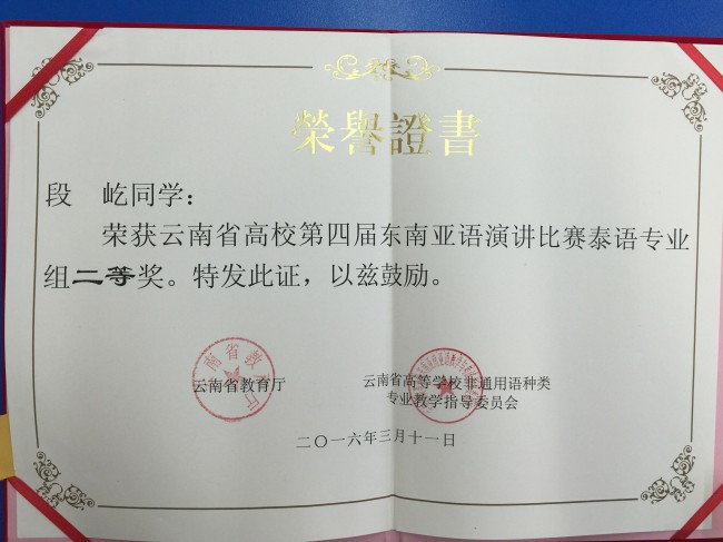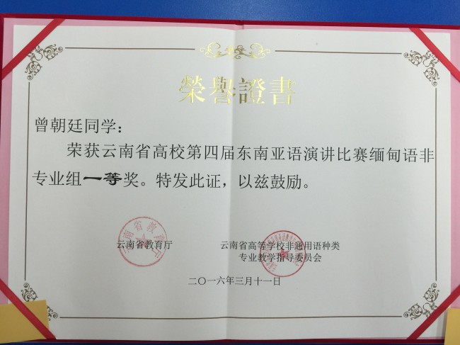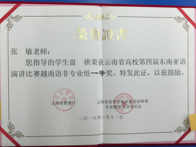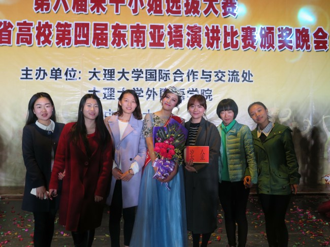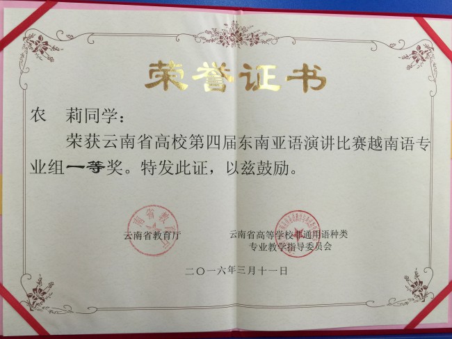 本次比赛以“一带一路·共筑云南梦”为主题,共有来自全省27所高校的68名选手参加比赛。我校6名演讲类参赛选手表现出色,荣获3个一等奖、1个二等奖和2个三等奖,创下历史最好成绩。其中,曾朝廷荣获缅甸语非专业组一等奖,农莉荣获越南语专业组一等奖,盘祺荣获越南语非专业组一等奖;段屹荣获泰语专业组二等奖;颜琳荣获泰语非专业组三等奖,白纯荣获缅甸语专业组三等奖。此外,代表我校参加大理大学宋干小姐选拔赛的吴倩文同学荣获季军。