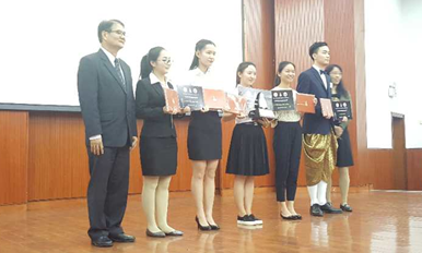 5月5日,华文学院刀丽老师带领六位同学到成都参加了泰国孔敬大学和中国成都大学联合举办的中国高校泰语演讲及技能大赛。大赛共有来自全国十余所高校的学生参加,大赛的主题为“跟随国王的脚步”,分为演讲、书法、讲故事及唱歌四项比赛,每项比赛分别设置了一等奖1名、二等奖1名、三等奖2名。